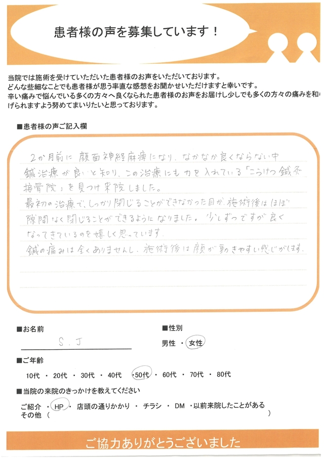 顔面神経麻痺になり半年過ぎるも治らず、ほぼ諦めかけては鏡で顔を見て落ち込む日が続き、以前から気になりながらも針が怖くて来ることができませんでしたが、このままでは後悔すると思い「こうけつ鍼灸接骨院」さんへ予約を入れました。