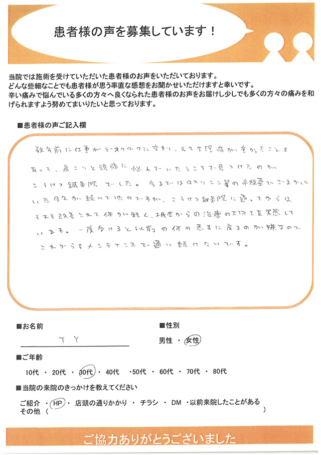 こうけつ鍼灸院にきて良かったと思っています。ありがとうございました。