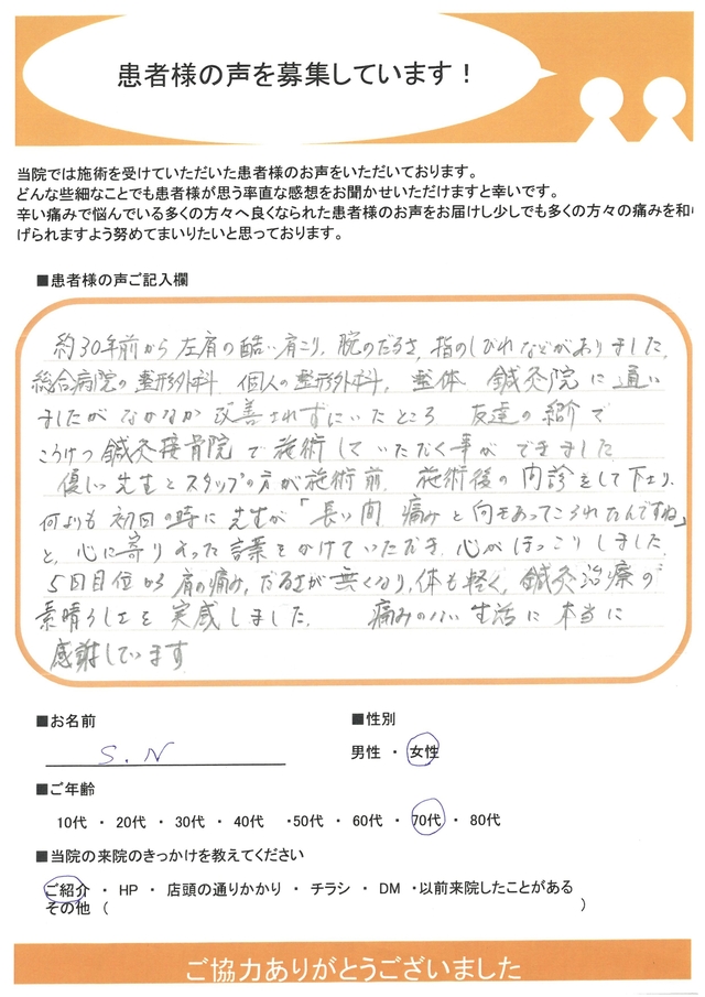 又、肩の痛かった時、首の痛かった時も”ハリ”のお蔭で本当に助かりました。ただ位置は”ツボ”が分かりませんので先生に打っていただいてます。残りどれ位命があるかわかりませんが当院様にお世話になるつもりでございます。