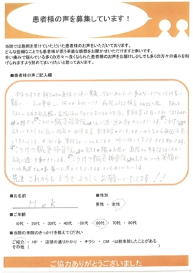 何年も継続して定期的に通われている患者様のお声をいただき良くなられていることを本当にうれしく思います。