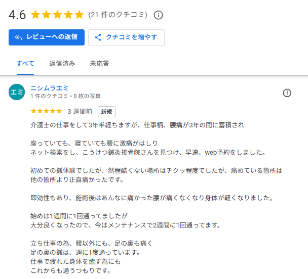 介護士の仕事をして3年半経ちますが、仕事柄、腰痛が3年の間に蓄積され、座っていても、寝ていても腰に激痛がはしり、ネット検索をし、こうけつ鍼灸接骨院さんを見つけ、早速、web予約をしました。